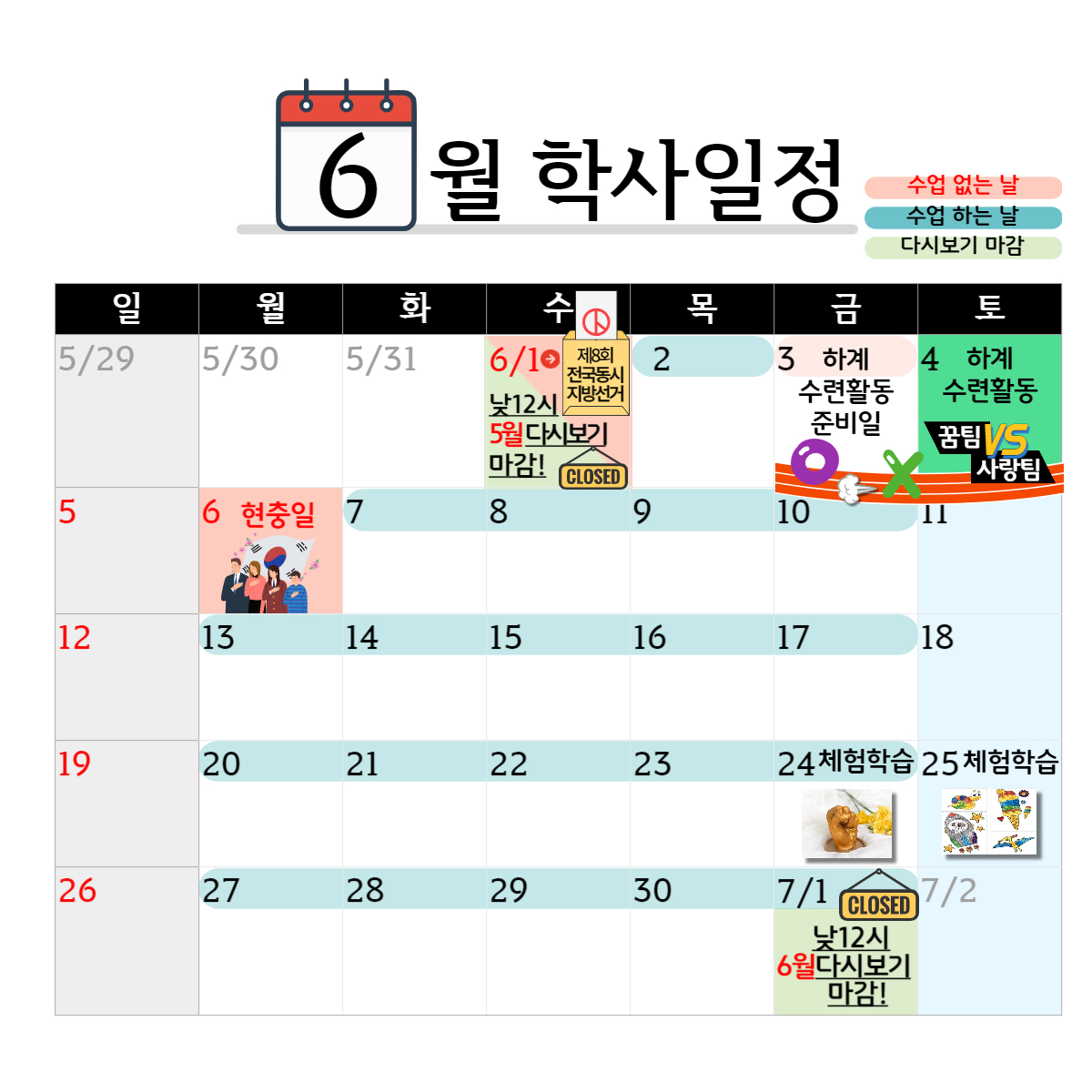 ![]() [2022Çг⵵ 6¿ù ÇлçÀÏÁ¤ ¾È³»] ¾È³çÇϼ¼¿ä ²Þ»ç¶ûÇб³ÀÔ´Ï´Ù. 1, 6¿ù 1ÀÏ(¼ö) Á¦8ȸ Àü±¹µ¿½ÃÁö¹æ¼±°Å, 6¿ù 3ÀÏ(±Ý) ¿Â¶óÀο©¸§¼ö·Ãȸ Áغñ ¹× ¿¹Ç࿬½À, 6¿ù 6ÀÏ(¿ù)Àº ÇöÃæÀÏ·Î ½Ç½Ã°£ ¼ö¾÷ ¹× ´Ù½Ãº¸±â ¼ö¾÷ÀÌ ÁøÇàÀÌ µÇÁö ¾Ê½À´Ï´Ù. 2. 6¿ù 4ÀÏ(Åä)Àº Çϰè¼ö·Ãȸ³¯ÀÔ´Ï´Ù. ¸¹Àº Âü¿© ¹Ù¶ø´Ï´Ù. 3. 6¿ù 24~25ÀÏÀº ¿Â¶óÀÎüÇèÇнÀ ³¯ÀÔ´Ï´Ù. °øÁö¸¦ È®ÀÎÇØ ÁÖ¼¼¿ä